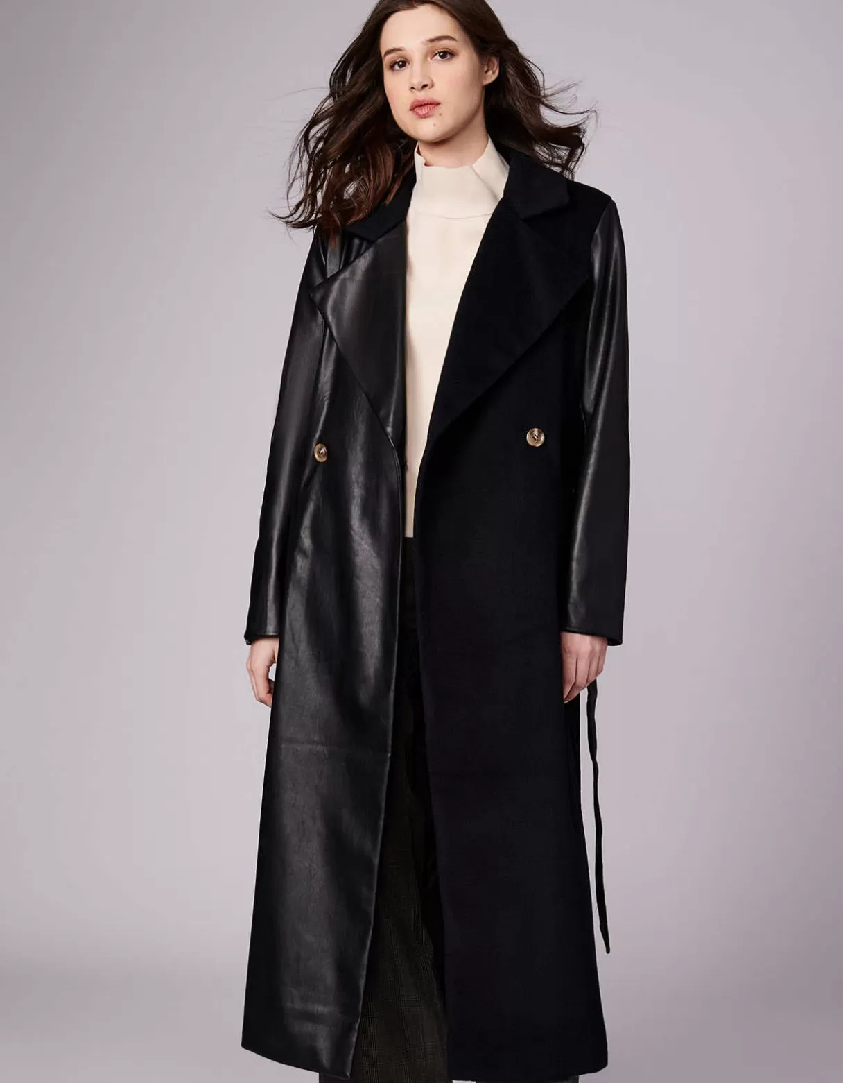 Bernardo Exclusive. Embrace The Look Of Leather In A Perfect Vegan Pretender With This Long Belted Coat For Fall And Winter. Split Between Vegan Leather And Wool This Coat Has A Unique Finish That Sets It Apart. Style It Cinched With The Tie Belt For A Streamlined Look Over Dress Pants, Or Wear It Loose And Open For A Carefree Look With Denim And Skirts. Oversized Patch Pockets Combine Fashion With Function—A Great Place To Keep Your Phone Handy For Quick, Easy Access.